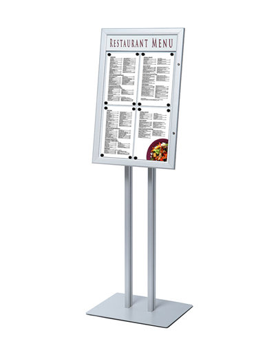 Elegantne ja vastupidav menüüalus, mis sobib suurepäraselt restorani menüü, päevapakkumiste või muu olulise info esitlemiseks. Kahe jalaga tugev terasalus tagab stabiilsuse ning lukustatav esipaneel hoiab sisu turvaliselt paigal.